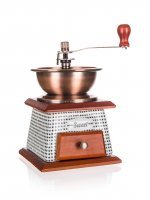 Ruční mlýnek na kávu SWEET HOME s keramickým mechanismem, dekorované keramické tělo s dřevěnými doplňky a kovovou násypkou. Keramickou mlecí mechaniku lze nastavit na požadovanou hrubost mletí.